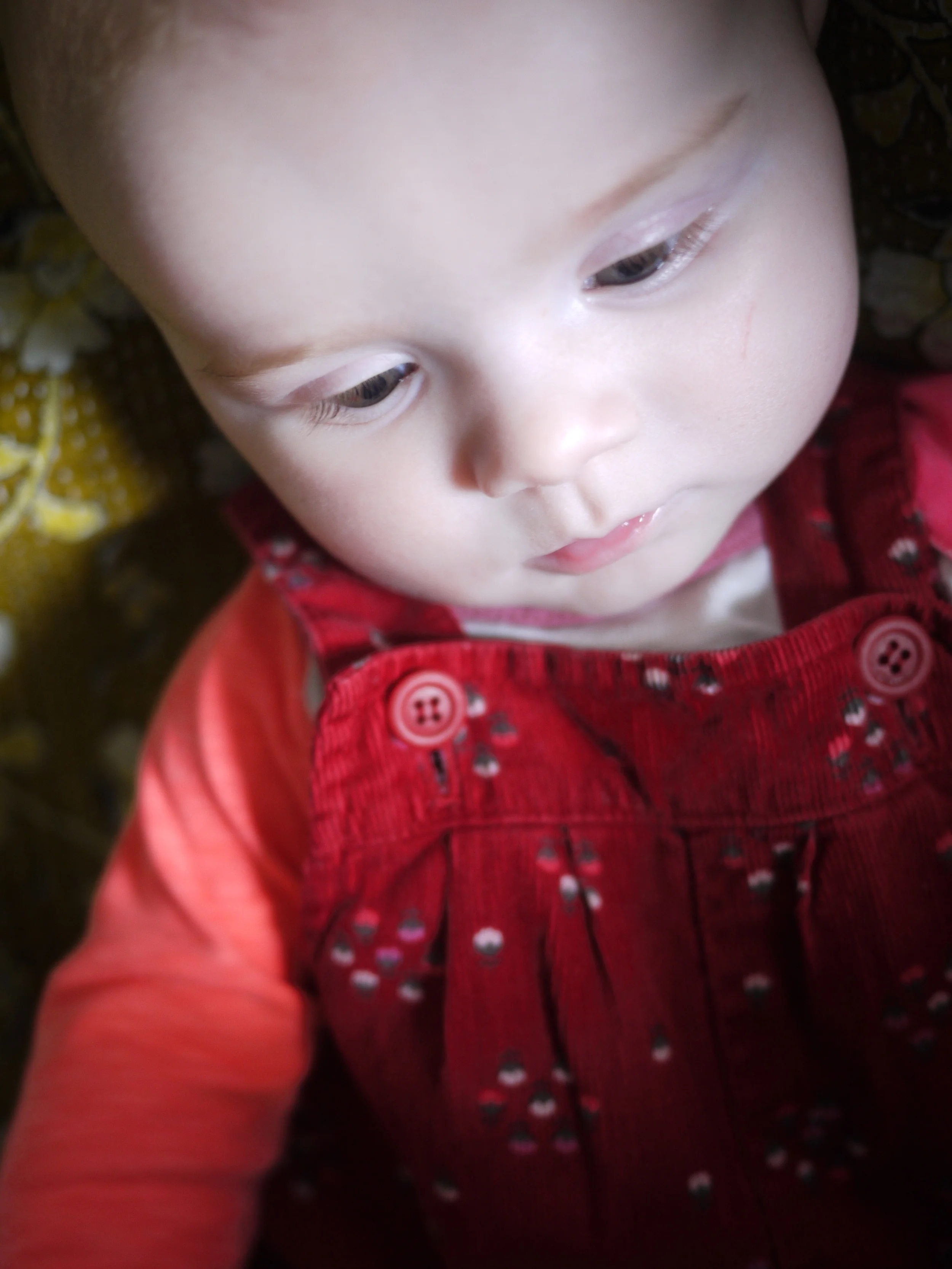 Eyes are changing from newborn steal to warm-olive (but I don't think they will be brown they will be more hazel or if she's lucky green like her dad). click on image below to see another shot from City Farmer.